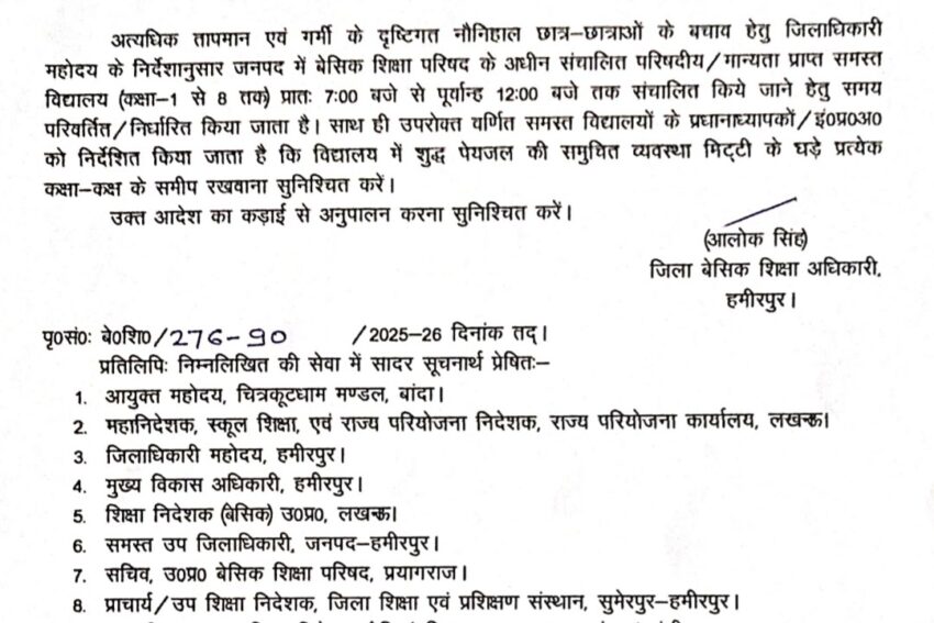 अत्यधिक तापमान एवं गर्मी के दृष्टिगत जिले में समय परिवर्तन का आदेश जारी
