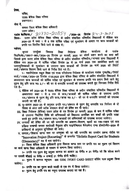 उत्तर प्रदेश बेसिक शिक्षा परिषद के अधीन संचालित परिषदीय विद्यालयों में शैक्षिक सत्र 2024-25 में कक्षा 1 से 8 तक वार्षिक परीक्षा एवं मूल्यांकन के आधार पर छात्र छात्राओं को प्रगति पत्र वितरित किये जाने के संबंध में।