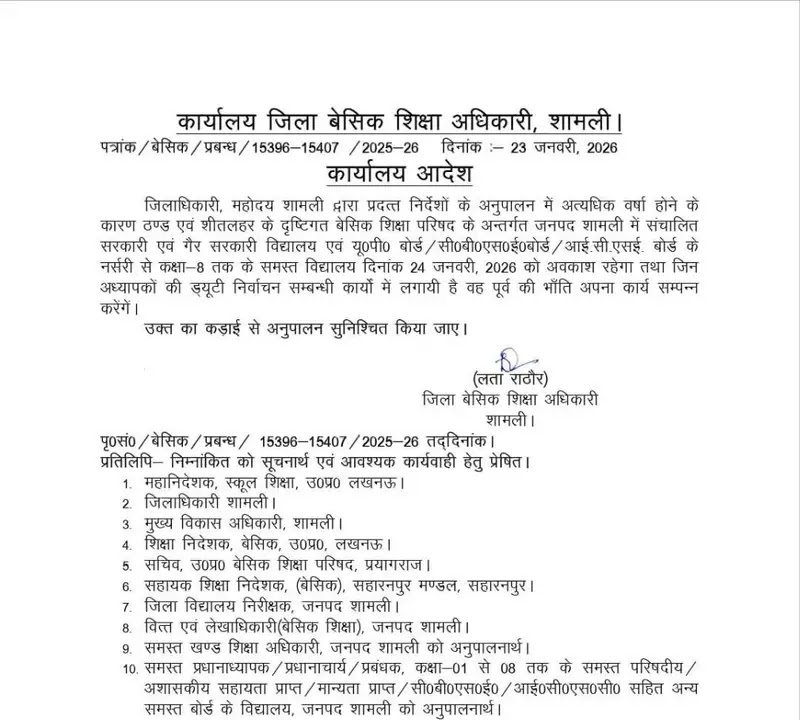 शामली। : जिले में ठंड और शीतलहर के चलते 24 जनवरी 2026 को नर्सरी से कक्षा 8 तक के सभी स्कूल बंद रहेंगे। जिला बेसिक शिक्षा अधिकारी शामली द्वारा जारी आदेश के अनुसार बेसिक शिक्षा परिषद के अंतर्गत संचालित सभी सरकारी, गैर सरकारी, सहायता प्राप्त, मान्यता प्राप्त तथा यूपी बोर्ड, सीबीएसई और आईसीएसई बोर्ड से संबद्ध विद्यालयों में अवकाश रहेगा।