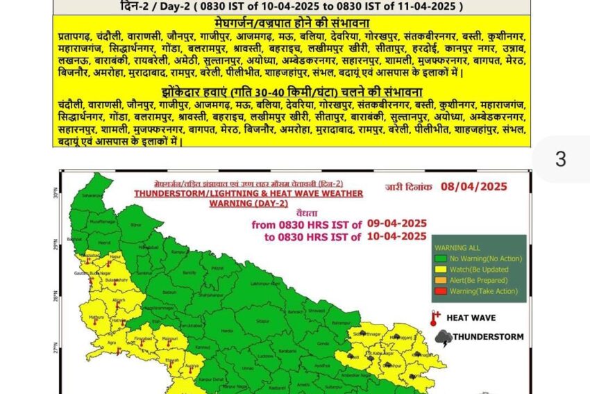 प्रतापगढ़, चंदौली, वाराणसी, जौनपुर, गाजीपुर, आजमगढ़, मऊ, बलिया, देवरिया, गोरखपुर, संतकबीरनगर, बस्ती, कुशीनगर, महाराजगंज, सिद्धार्थनगर, गोंडा, बलरामपुर, श्रावस्ती, बहराइच, लखीमपुर खीरी, सीतापुर, हरदोई, कानपुर नगर, उन्नाव, लखनऊ, बाराबंकी, रायबरेली, अमेठी, सुल्तानपुर, अयोध्या, अंबेडकरनगर, सहारनपुर, शामली, मुजफ्फरनगर, बागपत, मेरठ, बिजनौर, अमरोहा, मुरादाबाद, रामपुर, बरेली, पीलीभीत, शाहजहांपुर, संभल, बदायूं व आसपास के इलाकों में गरज-चमक संग वज्रपात की संभावना है।