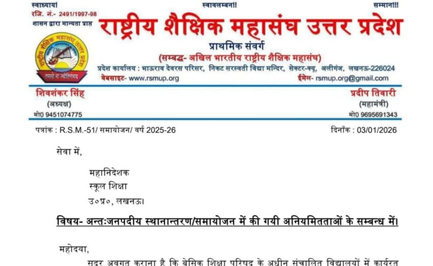 राष्ट्रीय शैक्षिक महासंघ के प्राथमिक संवर्ग ने परिषदीय विद्यालयों में शिक्षकों के तीसरे चरण के समायोजन में अनियमितता के आरोप लगाए हैं। साथ ही इन समायोजन को निरस्त करने की मांग की है। प्रदेश अध्यक्ष शिवशंकर सिंह ने बताया कि बेसिक के विद्यालयों में शिक्षकों के शैक्षिक सत्र 2025-26 में तीसरे चरण के समायोजन में शिक्षकविहीन व एकल विद्यालयों में सरप्लस को समायोजित करने का आदेश शासन ने दिया था। इस क्रम में जिला स्तर पर गठित समिति द्वारा समायोजन की कार्यवाही 30 दिसंबर तक की जानी थी। किंतु जिला स्तर पर समायोजन में काफी गड़बड़ी की गयी हैं।