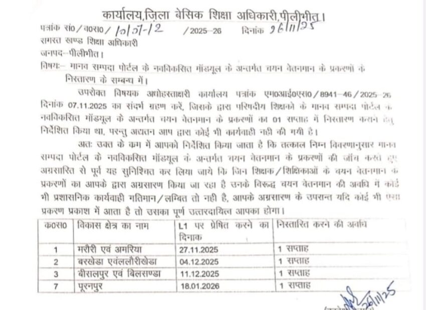 चयन वेतनमान के संबंध में पीलीभीत जिले का आदेश। प्रत्येक ब्लॉक को एक सप्ताह का समय दिया गया।