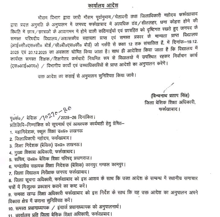 जनपद मे दिनांक 19.12.2025 & 20.12.2025 को शीत अवकाश घोषित
