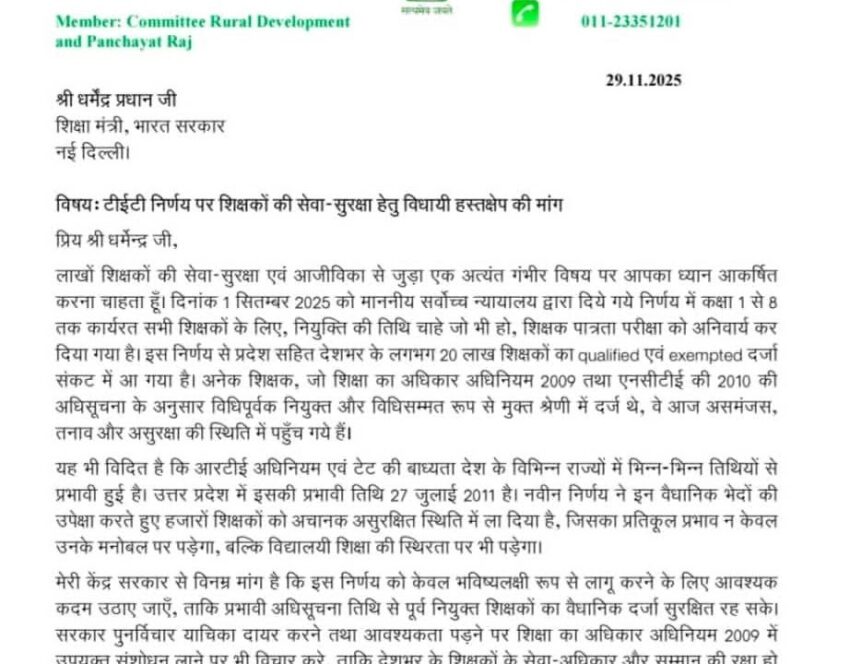 टीईटी निर्णय पर शिक्षकों की सेवा सुरक्षा हेतु विधायी हस्तक्षेप की मांग..