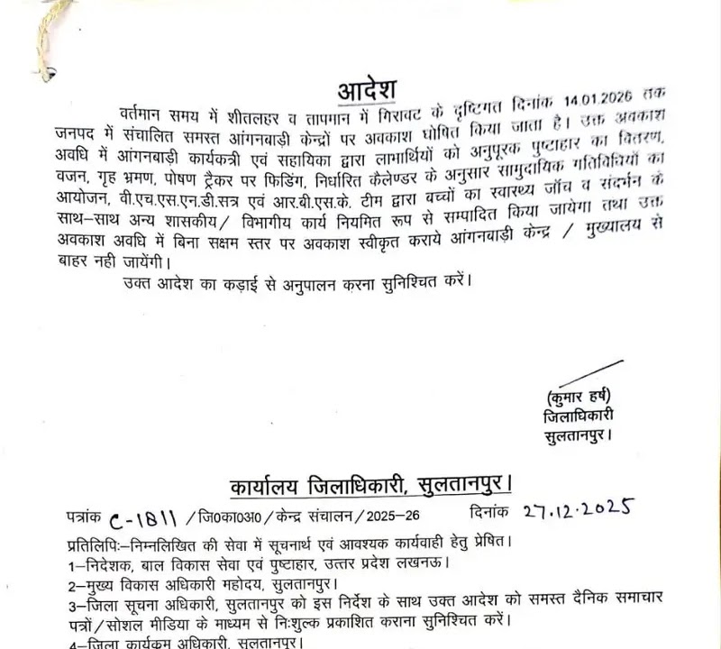 बिग ब्रेकिंग न्यूज: भीषण ठंड के चलते उत्तर प्रदेश के इस जिले में 14 जनवरी तक आंगनबाड़ी केंद्रों पर अवकाश घोषित, देखिए आदेश