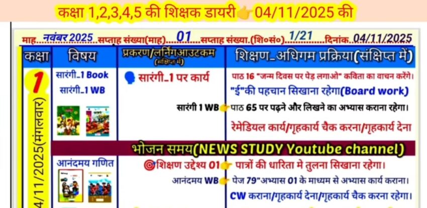 दिनांक 04 नवंबर 2025 कक्षा- 01, 02, 03, 04, 05 की भरी हुई शिक्षक डायरी , देखें