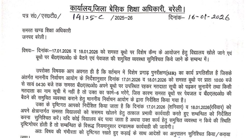 दिनांक:-17.01.2026 व 18.01.2026 को समस्त बूथो पर विशेष कैम्प के आयोजन हेतु विद्यालय खोले जाने एवं बूथो पर बी०एल०ओ० के बैठने एवं पेयजल की समुचित व्यवस्था सुनिश्चित किये जाने के सम्बन्ध में।