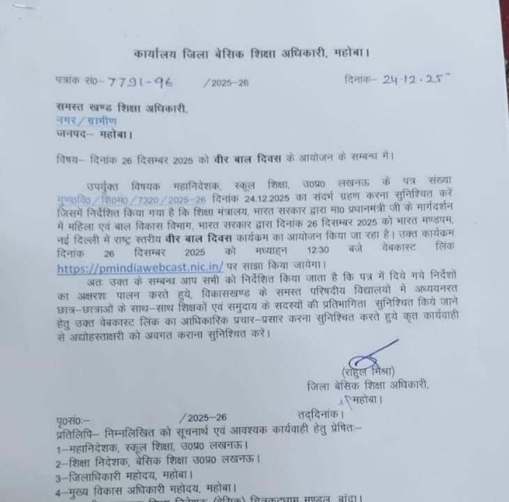 दिनांक 26 दिसम्बर 2025 को वीर बाल दिवस के आयोजन के सम्बन्ध में।
