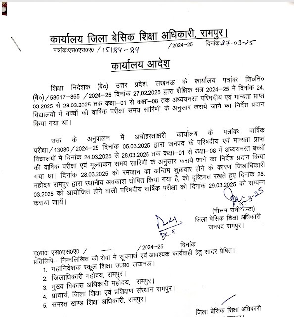 उक्त के अनुपालन में अधोहस्ताक्षरी कार्यालय के पत्रांकः वार्षिक परीक्षा/13080/2024-25 दिनांक 05.03.2025 द्वारा जनपद के परिषदीय एवं मान्यता प्राप्त विद्यालयों में दिनांक 24.03.2025 से 28.03.2025 तक कक्षा-01 से कक्षा-08 में अध्ययनरत बच्चों की वार्षिक परीक्षा एवं मूल्याकन समय सारिणी के अनुसार कराये जाने का निर्देश प्रदान किया गया था। दिनांक 28.03.2025 को रमजान का अन्तिम शुक्रवार होने के कारण जिलाधिकारी महोदय रामपुर द्वारा स्थानीय अवकाश घोषित किया गया है, को दृष्टिगत रखते हुए दिनांक 28. 03.2025 को आयोजित होने वाली परिषदीय वार्षिक परीक्षा को दिनांक 29.03.2025 को सम्पन्न कराया जायें।