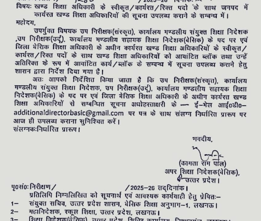 *बीईओ के स्वीकृत/ कार्यरत/ रिक्त पदों की ई – मेल के माध्यम से प्रेषित* करने के संबंध में आदेश जारी👆✍️