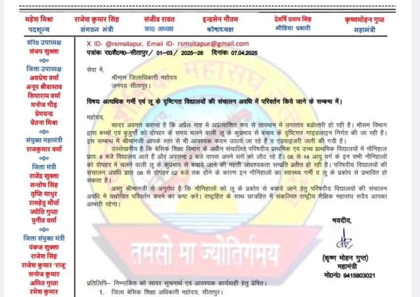 राष्ट्रीय शैक्षिक महासंघ द्वारा अत्यधिक गर्मी व लू के कारण विद्यालय समय परिवर्तित करने के सम्बन्ध में जिलाधिकारी महोदय को ज्ञापन प्रेषित किया गया।