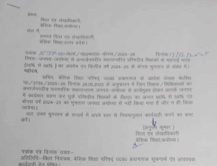 *वित्त एवं लेखाधिकारी अयोध्या ने अयोध्या से अंतर्जनपदीय स्थानांतरित शिक्षकों क़े मंहगाई भत्ता 55%से58% भुगतान क़े सम्बन्ध में आदेश*